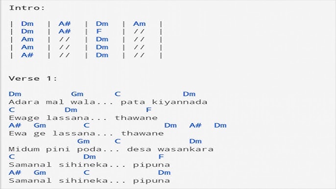 Chords for Adara Mal Wala Karaoke Without voice ආදර මල වල පට කයනනද A Dm F Gm G C D Am Bb Chords for Adara Mal Wala Karaoke Without voice ආදර මල වල පට කයනනද with song key BPM capo transposer play along with guitar piano ukulele mandolin.